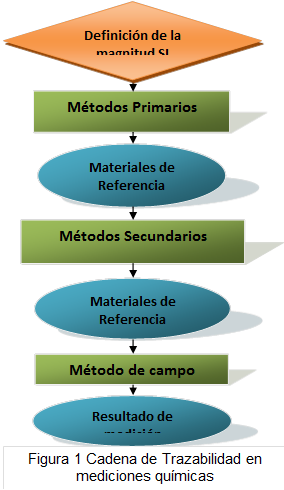 Como se logra esto? Es importante enlazar los resultados obtenidos dentro de la cadena de trazabilidad (ver figura 1). Entiéndase por cadena de trazabilidad a la secuencia valor –medición –valor – medición –etc., la cual conecta el valor del resultado de una medición hacia un valor conocido, el cual proviene del Material de Referencia Certificado.